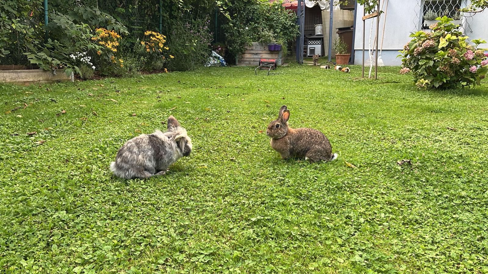 Ich durfte vor kurzem bei einem einsamen Rammler einziehen. Wir haben ein richtig tolles Außengehege – mit frischer Luft, viel Platz zum Hoppeln und ausreichend Versteckmöglichkeiten. Und das Beste: Unter Aufsicht dürfen wir sogar im Garten frei laufen. Gras unter den Pfoten, Sonne im Fell - was will ein Kaninchen mehr? (August 2024)